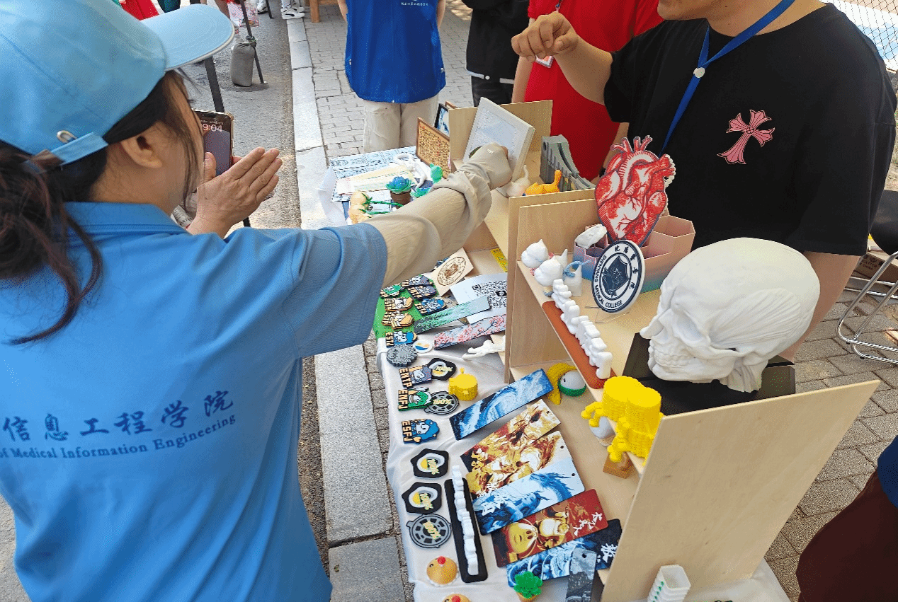 售卖现场,从佩戴校徽的毛绒玩具小熊,到融入听诊器、DNA双螺旋等医学符号的钥匙扣、笔记本,每款文创都暗藏巧思。其中,3D打印的小物件最受青睐,有人的头骨模型,小兔子,小狗等。设计团队员工表示,希望通过文创让师生在参与运动会时,更直观地感受校园文化的独特魅力。